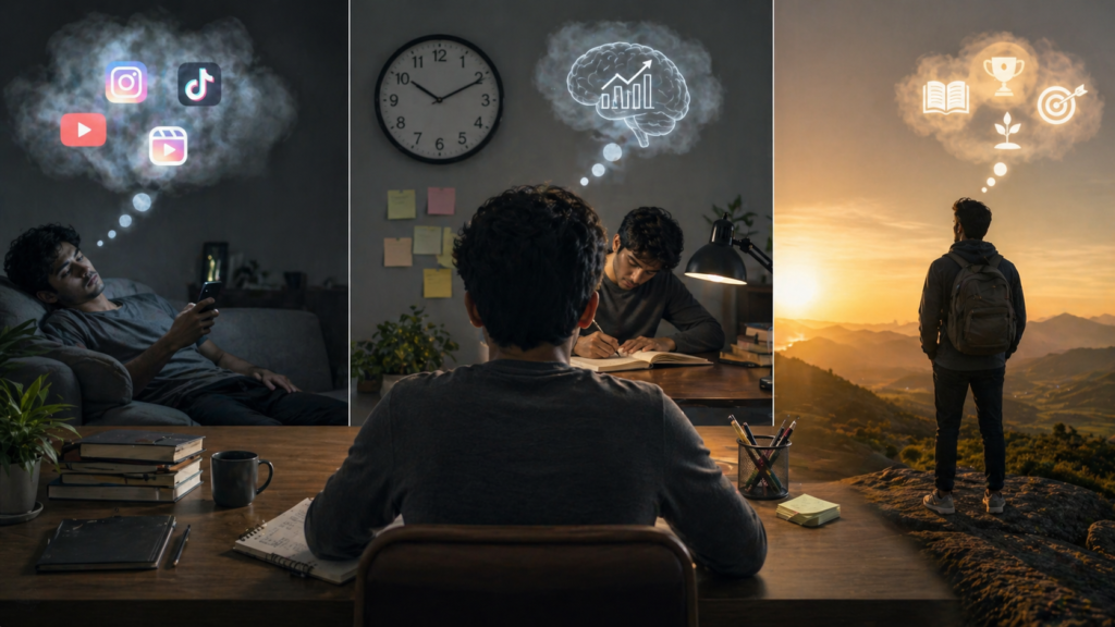 यह सब सुनने में अच्छा लगता है, लेकिन mind बड़े काम देखकर डर जाता है। उसे pressure दिखता है, struggle दिखती है, effort दिखता है। फिर वह बचने की कोशिश करता है… और सबसे आसान escape फिर वही phone बन जाता है।