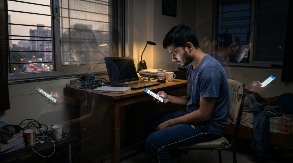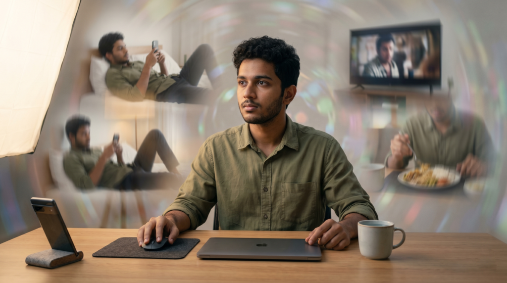 बस जैसे ही mind खाली हुआ, हाथ अपने आप phone की तरफ बढ़ता है। एक reel खुलती है, फिर दूसरी, फिर तीसरी… और देखते ही देखते 30-40 मिनट निकल जाते हैं। बाद में लगता है कि पता ही नहीं चला time कहाँ चला गया।
