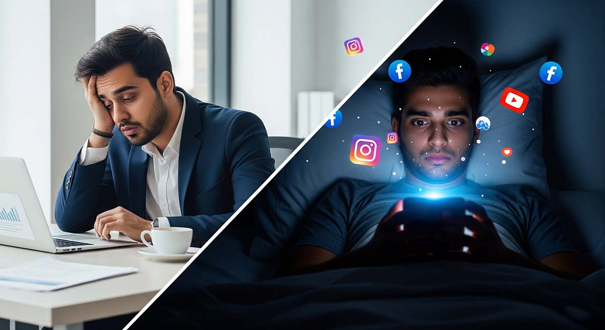लेकिन जैसे ही रात को बिस्तर पर लेटते हैं, वही थका हुआ इंसान अचानक energy booster पीकर जगा रहता है और मोबाइल पर स्क्रोल करता है – YouTube, Instagram, Facebook, Reels, Memes, News… और देखते-देखते रात के 2–3 बज जाते हैं।